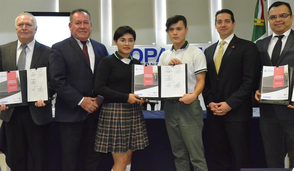 Conalep Sonora y el Centro Empresarial del Norte de Sonora (COPARMEX), llevaron a cabo esta mañana una Firma de Convenio y Colaboración para implementar el Modelo Mexicano de Formación Dual en la Empresa Leoni. Dos estudiantes de Conalep Hermosillo II serán los pioneros del Modelo Mexicano de Formación Dual en Hermosillo, al llevarse a cabo dicho convenio de colaboración. Dulce Adilene Guzmán Coellar y Omar Leonel Orozco Miranda son los jóvenes que cursan el cuarto semestre y pertenecientes a la carrera de informática de dicho plantel y que recibirán por parte de la empresa un apoyo mensual de 2 mil pesos, transportación y alimentación. Dicho evento, contó con la presencia del Lic. Arturo Fernández Díaz, Presidente del Centro Empresarial del Norte de Sonora, Ing. Alejandro Cid Fierro, Director del Centro de Diseño Américas, Mtro. Onésimo Mariscales Delgadillo, Subsecretario de Educación Media y Media Superior y como invitado especial testificó la firma de colaboración el empresario Faustino Fernández Aguilar. El presente acuerdo se lleva a cabo como parte del Compromiso que la Gobernadora del Estado Claudia Pavlovich Arellano realizó para implementar el Modelo Mexicano De Formación Dual en atención a una línea estratégica de la Secretaria de Educación Pública , dando respuestas a objetivos generales y específicos enunciados en el Plan Estatal de Desarrollo y Programas Sectoriales de Educación 2016-2021, con la finalidad de que los jóvenes tengan en sus estudios un equilibrio armónico entre la formación teórica y la formación práctica , así lo señaló el Subsecretario de Educación Media y Media Superior Onésimo Mariscales, quién además celebró que ahora en Hermosillo una empresa como Leoni pueda concretizar esta clase de convenios , que van de la mano y bajo la coordinación de Conalep Sonora, quien tiene una historia en este Modelo de Formación Dual. El Director General de Conalep Sonora Carlos Silva Toledo, agradeció a cada uno de los integrantes que hoy firman este acuerdo, jóvenes de una nueva generación de empresarios que están participando de la mano con el subsistema desde hace algunos años y que concuerdan con la visión de que lo más importante para un joven que busca una formación técnica, es la práctica, y la práctica es lo que se va dar a partir de este convenio. Lunes, martes, miércoles y jueves, los muchachos estarán en la empresa, el día viernes en la escuela. Silva Toledo señaló que en esta práctica no solamente es de suma importancia lo técnico, si no la formación que tiene que ver con valores empresariales, la disciplina y la puntualidad a temprana edad. Por su parte Arturo Fernández indicó que es de suma importancia para él agradecer a integrantes del consejo directivo , presidentes de comisión de COPARMEX Sonora Norte , socios, empresarios y amigos por haber hecho de este convenio una realidad.