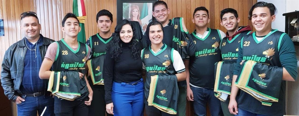 Esta mañana alumnos de Conalep Cd. Obregón y pertenecientes al equipo de Basketbol del plantel, recibieron sus uniformes deportivos de manos de la Directora Martha Teresa Perez Cazares.